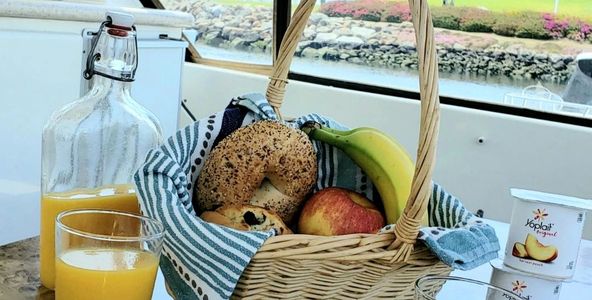 All of our guests enjoy a complimentary continental breakfast onboard their boat. Consisting of various fresh pastries, yogurt, fruit and orange juice. The boats are also stocked with complimentary bottled water, coffee/tea service and light snacks. We also offer complimentary WiFi, DirectTV and SmartTVs onboard our yachts.